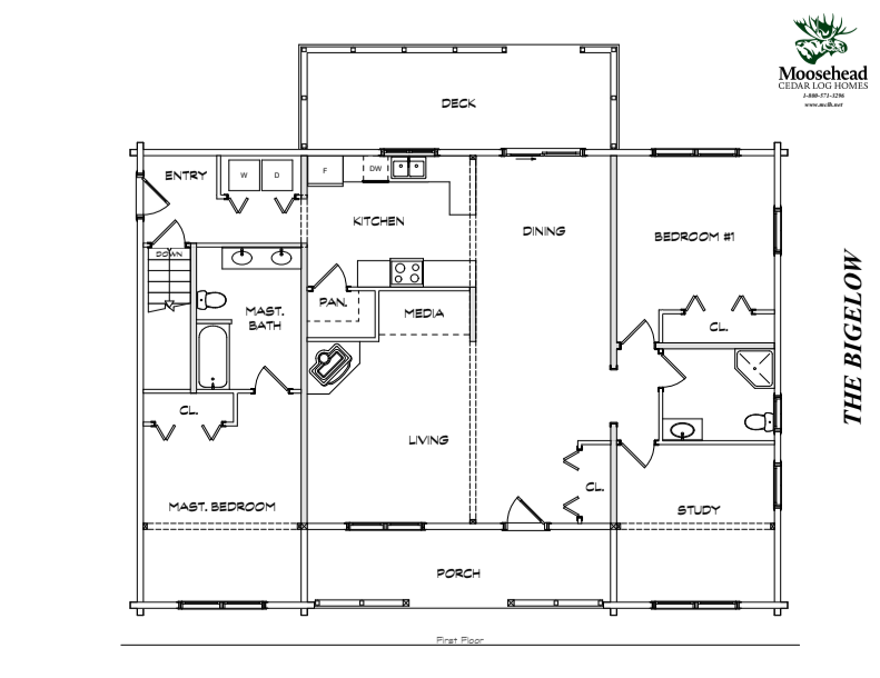 The Bigelow keeps it simple and convenient, without sacrificing style or comfort. The covered front porch entry opens to main living area, with the kitchen and dining room beyond. The large kitchen pantry offers plenty of storage, leaving the main space organized and open. Off the living room is the master suite, the guest bedroom and bathroom, and study. The dining room opens up to the large back deck, and through the kitchen is a back entryway with a laundry closet and basement access. Life is easy in the Bigelow!