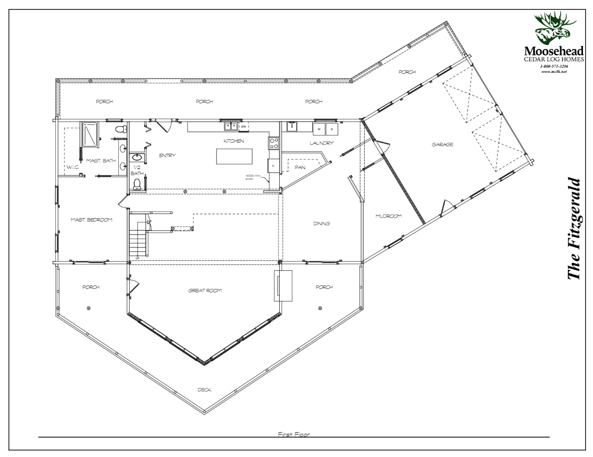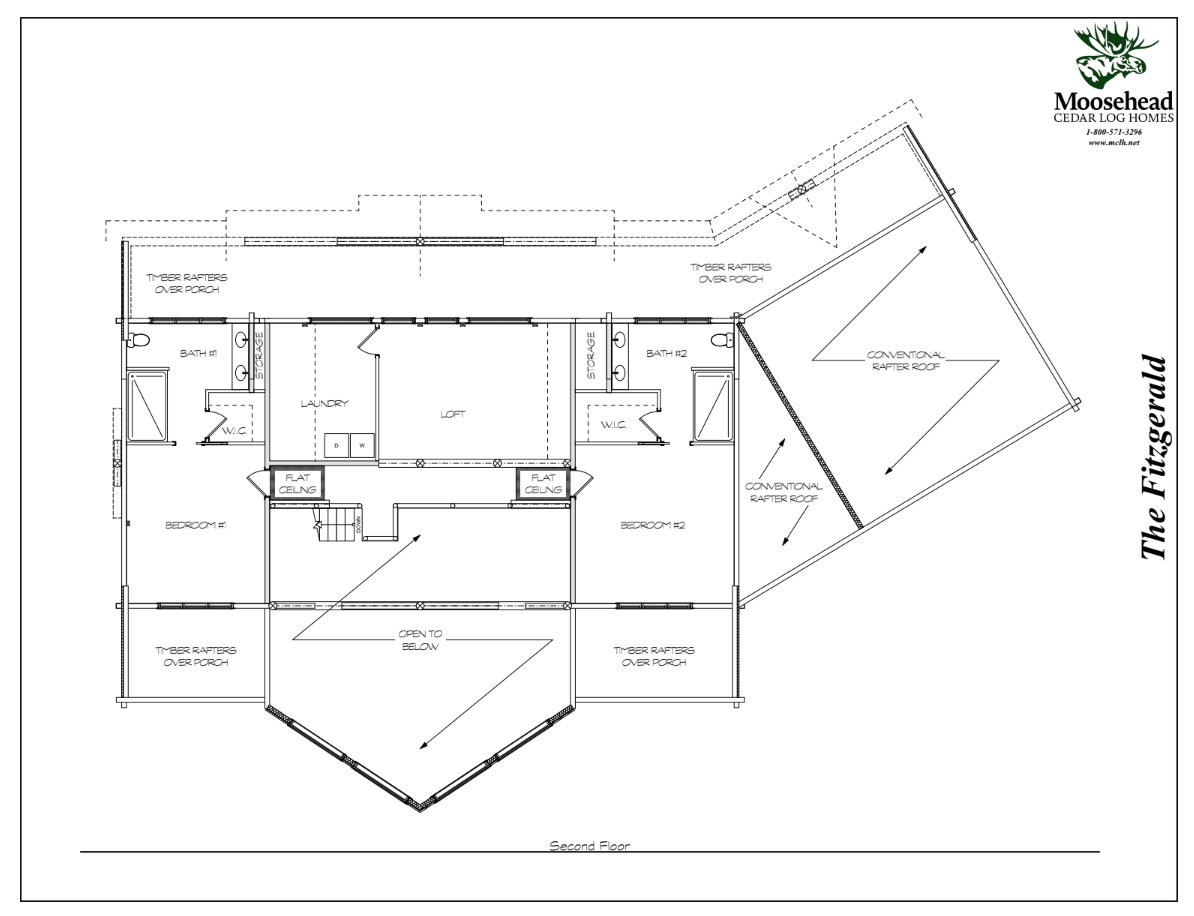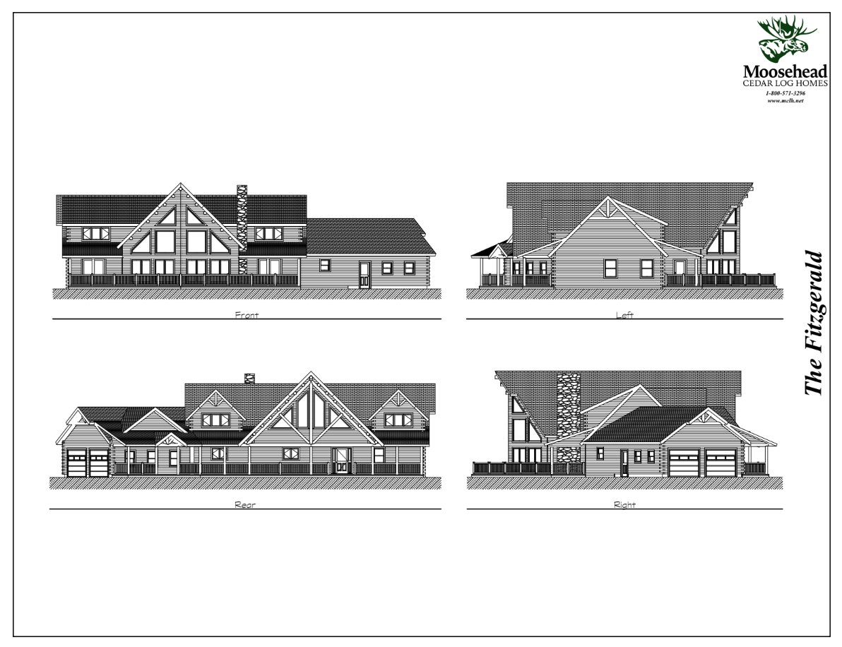 With its stylish rooflines, covered decks, and exposed trusses, the Fitzgerald is a dream log home. Inside, the smartly designed layout maximizes practicality for daily life with plenty of space for entertaining. From the attached garage, the mudroom accesses the first of two laundry rooms before opening up to the dining room and great room beyond. The angled walls of the great room allow for a wide expanse of views from floor to ceiling, with access to the covered side porch. On the back of the home, the kitchen opens up to the covered back porch, with the large master suite running the entire side of the first floor. Upstairs leads to a spacious loft and second laundry room, plus two more ensuite bedrooms.