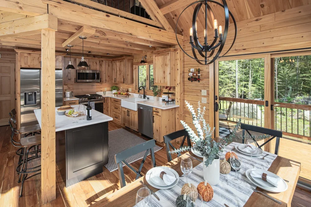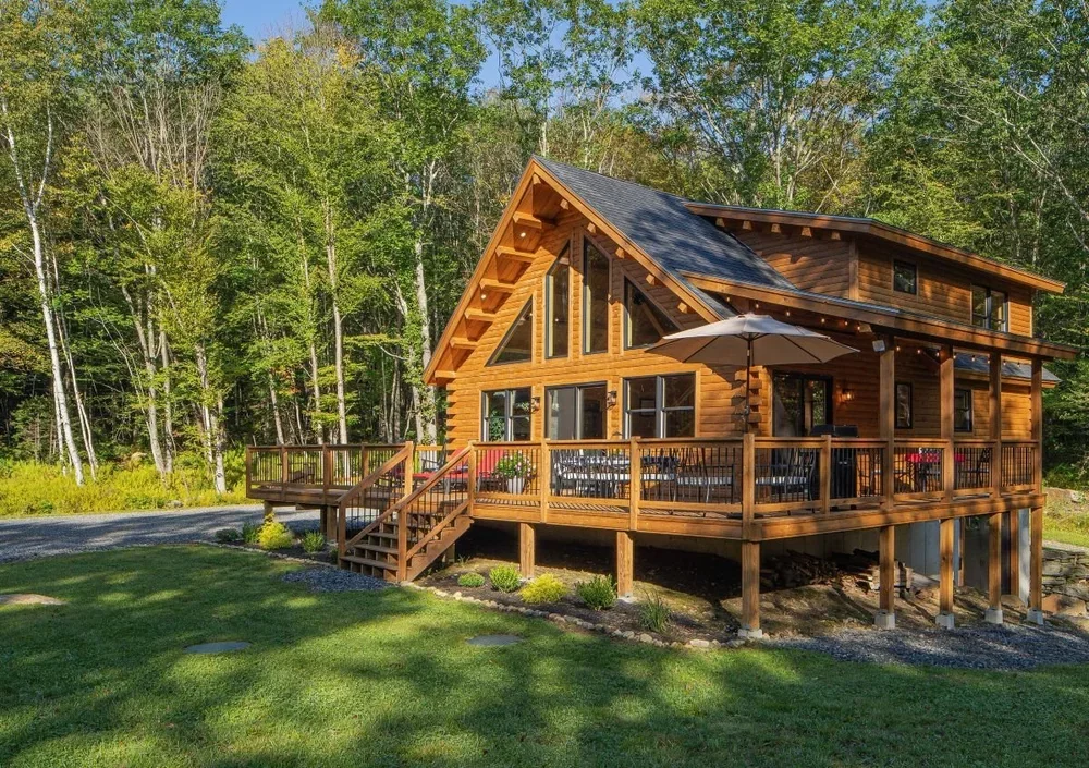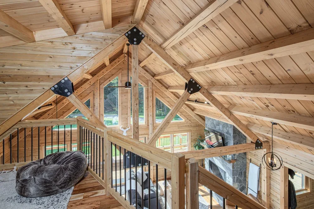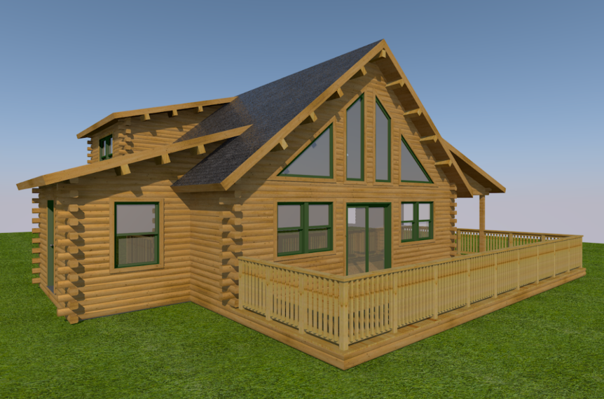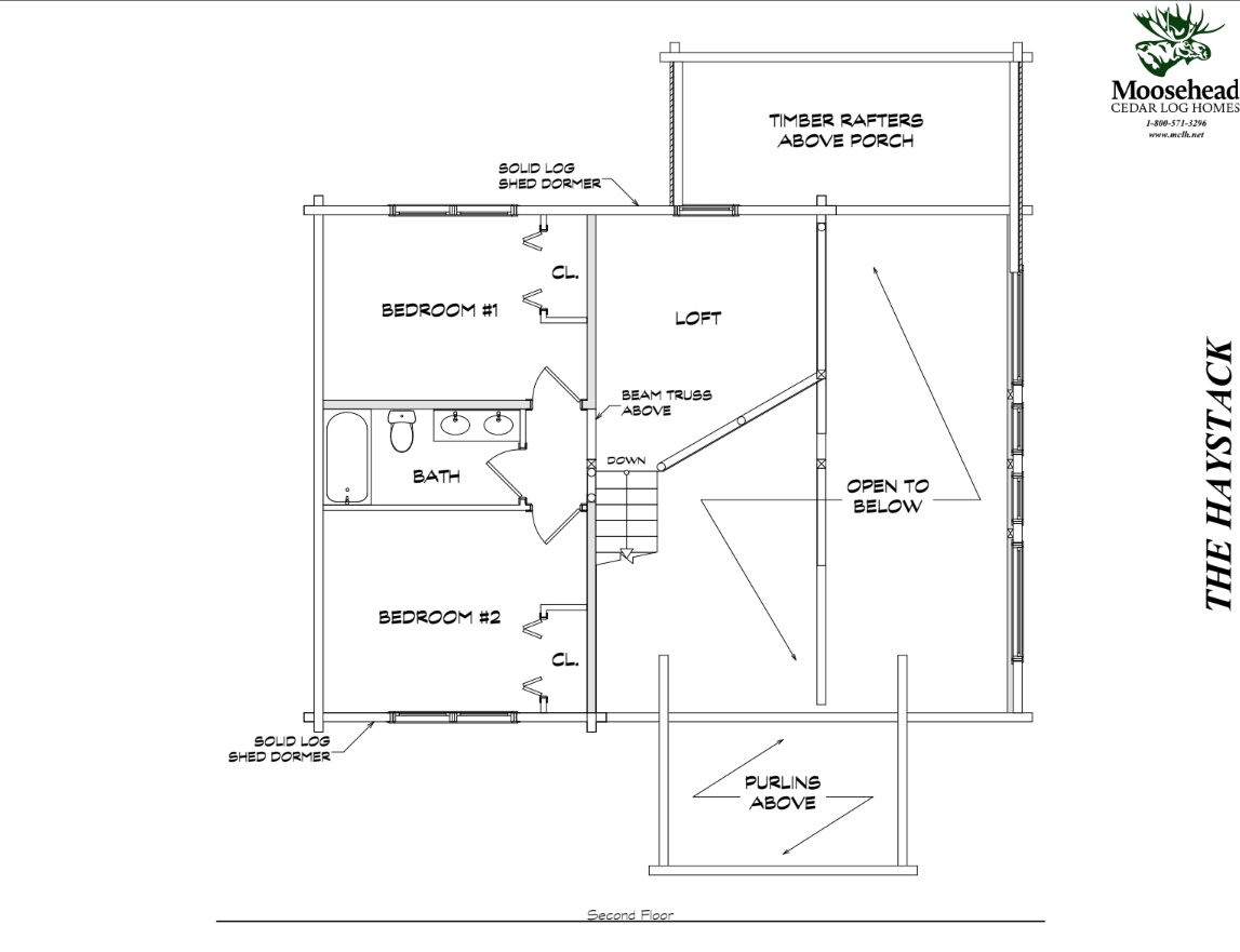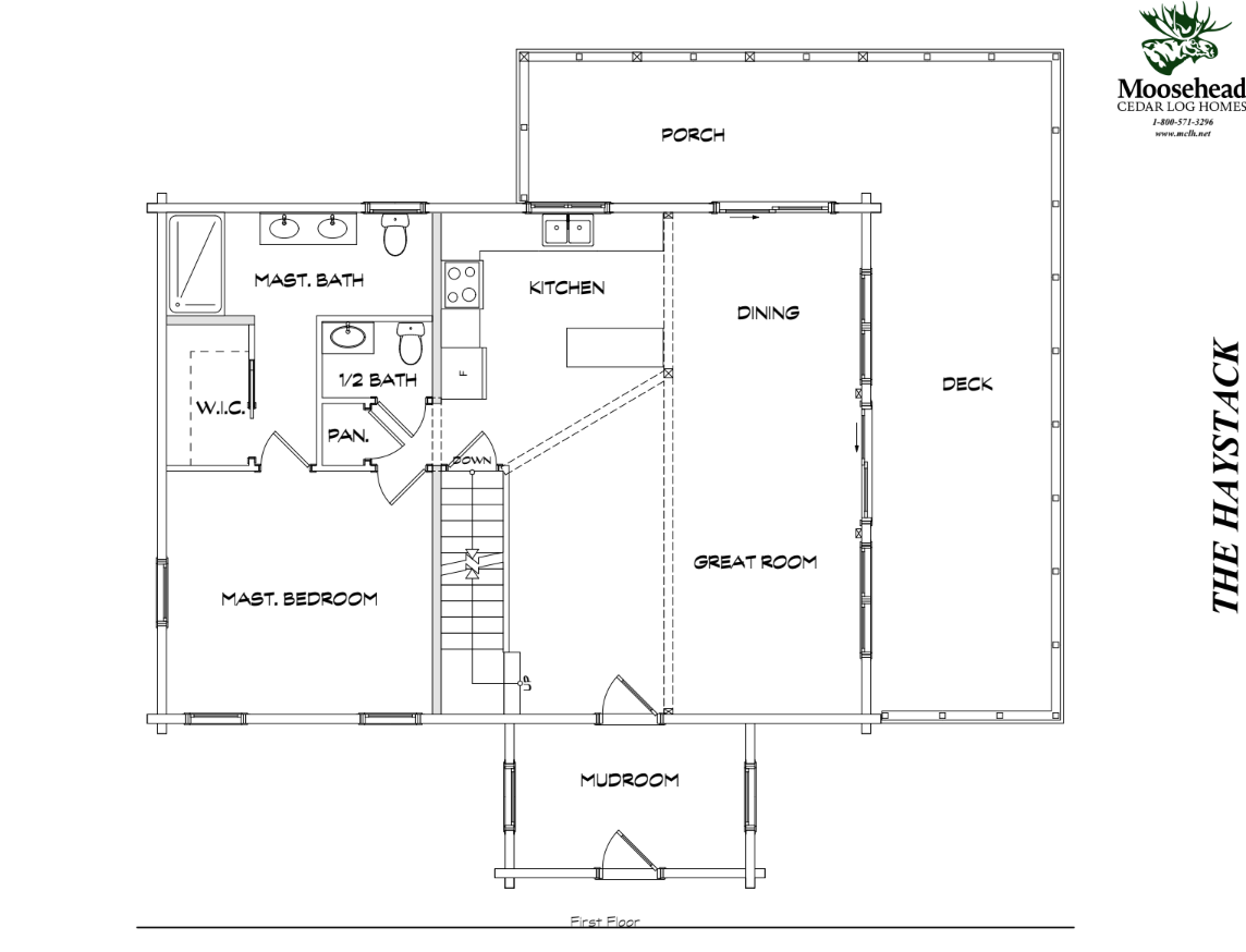The eye-catching design of the Haystack combines classic log cabin aesthetics with Craftsman-inspired architecture. The result is a stunning home both inside and out. Enter into the spacious mudroom, with plenty of natural light from two large windows and vaulted ceilings. The open floor plan lies ahead, with two stories of windows on the right, including sliding glass doors to the deck. The stairs on the left envelope the space, and the L-shaped kitchen is straight ahead with a dining area opening to the covered porch. A powder room and pantry are tucked just outside the kitchen. The master suite encompasses the left third of the main floor, with a large walk-in closet and spacious full bathroom. The loft above incorporates an angled rail for a view of the great room below. Also upstairs are two more bedrooms and a second full bathroom. The Haystack model offers a practical layout in a stunning package.