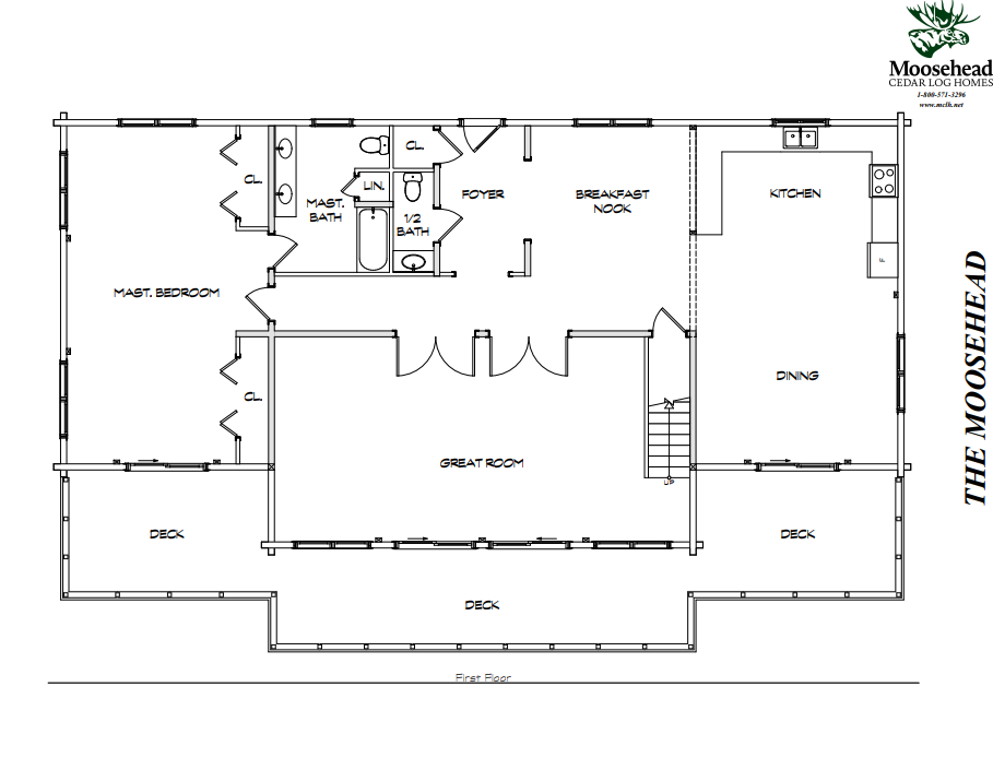 The Moosehead, as the name suggests, is our signature model. The design is true to its log cabin roots, featuring a soaring central great room, charming breakfast nook, and plenty of outdoor living space. From the back entrance, the foyer is complete with a closet and powder room, leading to double French doors to the vaulted great room. Large upper windows and views to the expansive front deck make this the perfect place for entertaining. To the left of the foyer is the breakfast nook, leading to the kitchen and dining room with access to the front deck. On the opposite side of the home is the spacious master suite, tucked down a private hallway. It features double closets, a full bathroom, and access to the front deck. The upstairs loft has a balcony overlooking the great room, as well as two guest bedrooms and full bath. Come home to the Moosehead, and see why it’s our signature model.