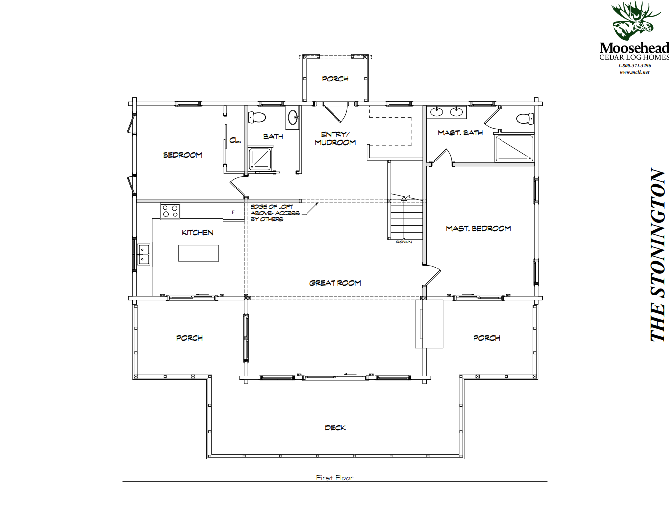 The soaring great room and floor to ceiling windows of the Stonington make it feel much larger than its square footage suggests, and the layout is designed with practicality in mind. The main entrance at the back of the home accesses a large mudroom with ample storage, and opens up to the vaulted great room with views to the front deck. The guest bathroom is conveniently located off the entrance, with the guest bedroom just beyond. To the right is the L-shaped kitchen with access to the covered front porch for easy outdoor dining. The master suite spans the entire left side of the home, with sliding doors to the front porch and a full bathroom. The second floor loft looks out over the great room and adds flexibility for storage, a reading nook, or a small office. Get the open feeling of a much larger home in an efficient package with the Stonington.